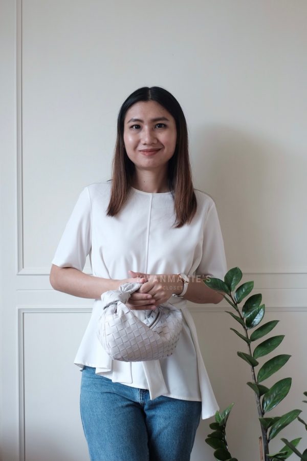 - หูถือจับสะดวกมือ คล้องแขนก็น่ารัก มีดีเทลเป็นปม (knot detail) ที่มุมด้านหนึ่งเก๋ ๆ โดย handle drop ประมาณ 10 cm (ถ้าแขนไม่ใหญ่มาก อาจสะพายขึ้นบ่าได้)