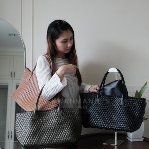 - ผลิตจากหนังแกะสานเป็นตารางถี่ ทรง tote
